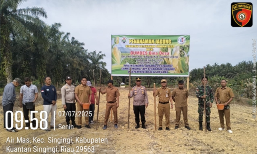 Sementara itu, di Desa Air Mas, Kecamatan Singingi, dilaksanakan kegiatan penanaman bibit jagung pipil varietas Pioneer di lahan masyarakat seluas 1,3 hektare. Penanaman dilakukan secara simbolis dan dilanjutkan gotong royong bersama masyarakat. Kegiatan ini dihadiri oleh Camat Singingi, Kapolsek Singingi, Babinsa, Kepala Desa, BPD, BUMDes, serta para tokoh masyarakat dan kelompok tani. Pelibatan seluruh elemen desa menunjukkan kekompakan dan keseriusan dalam menyukseskan program nasional ini.