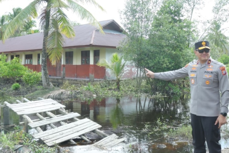 Setibanya di Pelabuhan Semulut, rombongan Wakapolda Riau langsung menuju lokasi jembatan rusak di SDN 18 Semulut.